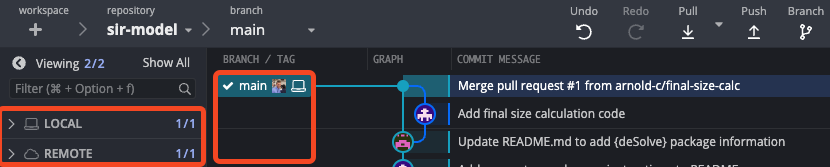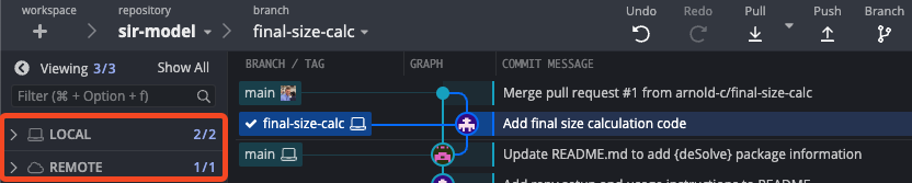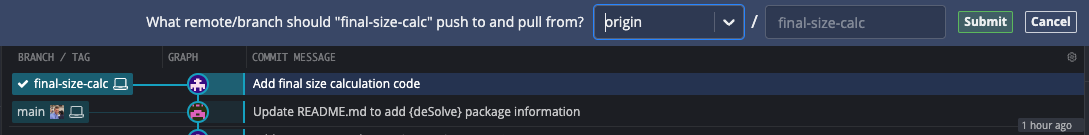 After entering a name, a new branch will be created, and we can see that we’re now on the new branch, final-size-calc. Hovering our mouse of the branch icon, we can see that both main and final-size-calc are listed, and we can switch between them by double-clicking on the branch we want to switch to. This also shows that both branches are currently at the same commit, as indicated by the horizontal marker pointing to the same commit.