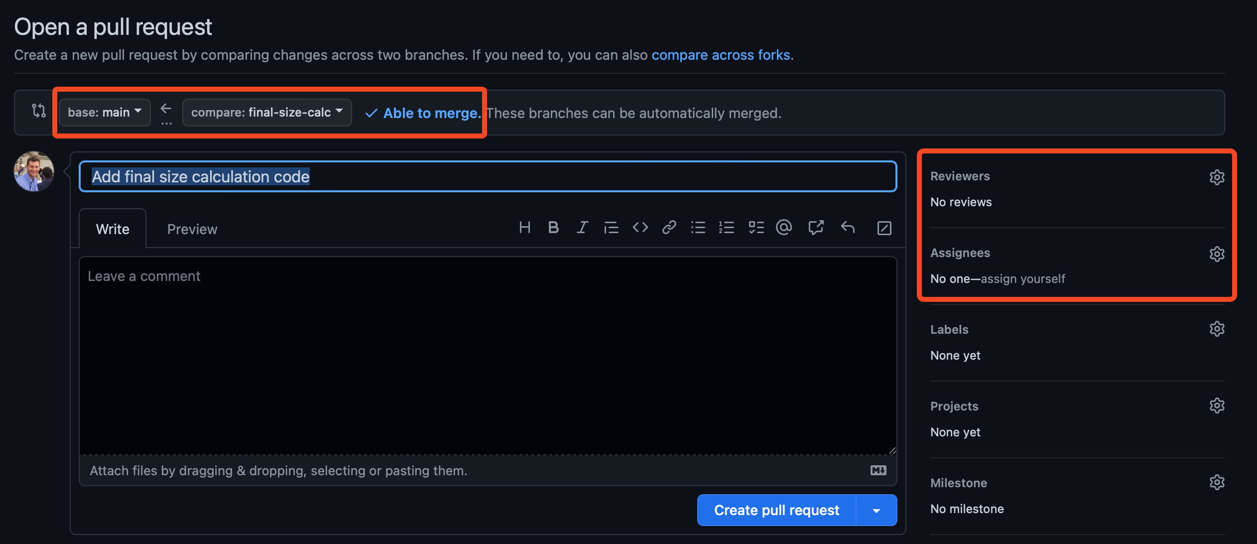 Doing so, we are presented with a lot of information. The key points are that there are two buttons at the top of the page that allow you to select which branches are being compared in the pull request, i.e., you want to merge together. The base branch is the branch that you want to merge into, and the compare branch is the branch that you want to merge from. So in this example, our changes happened on the final-size-calc (compare) branch, and we want to merge them into the main (base) branch. Because there are no conflicting changes, e.g., changes to the same lines of code, GitHub can automatically merge the branches for us, hence the “Able to merge” message.