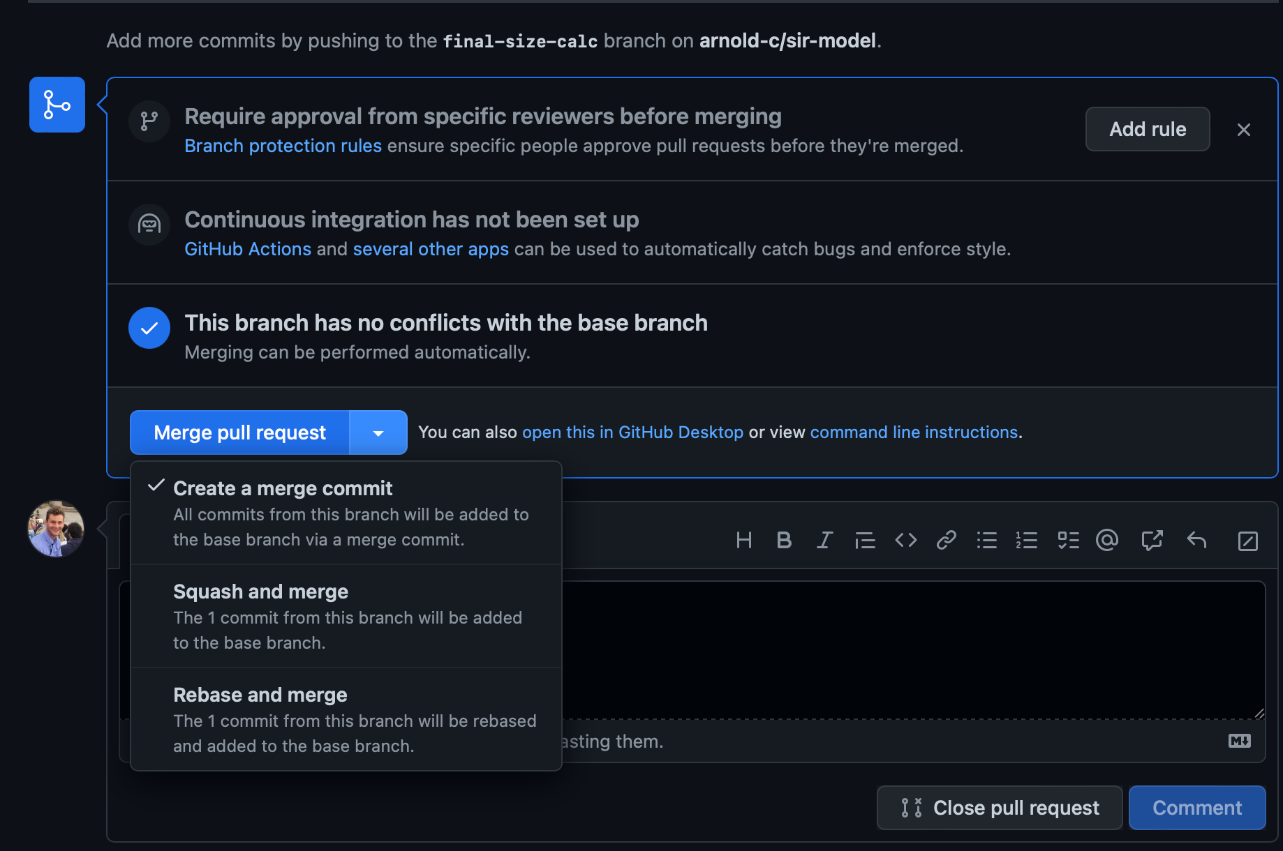 Now we’ve added code and pushed it to GitHub, we can keep going and add more code to the final-size-calc branch. But in this case, we’re done, so we can merge the final-size-calc branch back into the main branch. You can do this on your local machine, but let’s do it on GitHub with a pull request, as this is more appropriate for collaborative work, and doesn’t require any additional steps when we’re working on our own, so is a better default workflow.